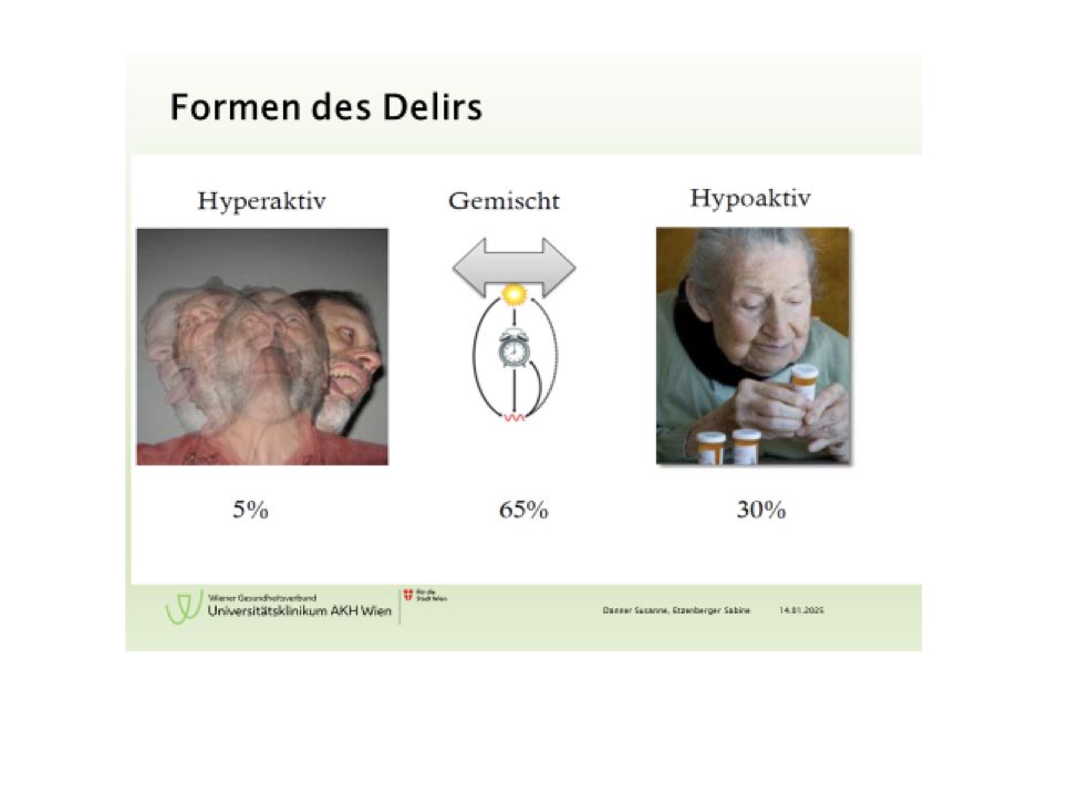 Dabei handelt es sich um eine akute organisch bedingte, (teilweise) reversible, Funktionsstörung des Gehirns mit fluktuierenden psychiatrischen Symptomen, Aufmerksamkeitsstörung sowie Bewusstseinsstörung oder Denkstörung. Die auftretende Wesensveränderung der Patient:innen stellt im Genesungsprozess nicht nur für das multiprofessionelle Team eine Herausforderung, sondern auch für die An- und Zugehörige. Therapieansätze sind vielfältig und werden vom gesamten Behandlungsteam getragen. Zu den nicht medikamentösen Therapiemaßnahmen zählen zum Beispiel: Tag-/Nachtrythmus schaffen, persönliche Gegenstände (Brille, Handy, Zahnprothesen, Hörgeräte) geben, zeitliche/ örtliche/ personenbezogene Orientierung, Lagerung, Mobilisation und klare Kommunikation.