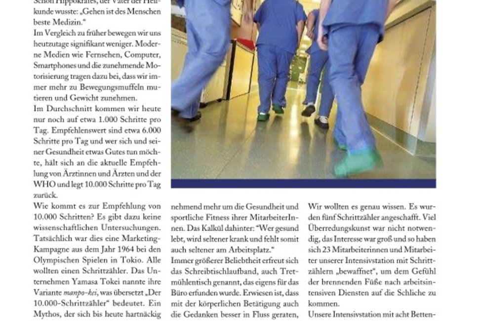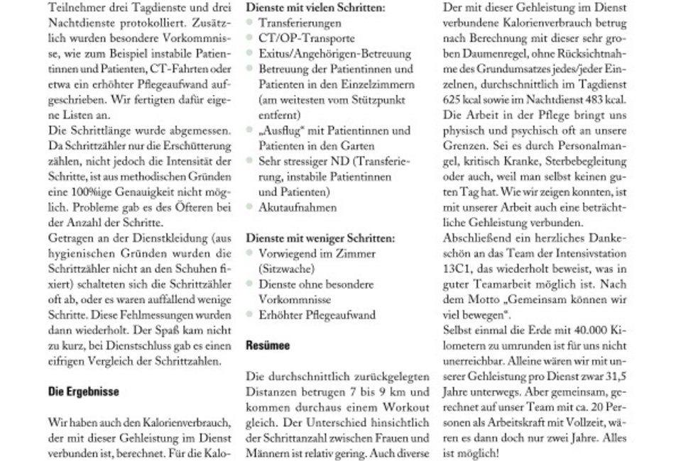 „Gehen ist gesund – Wie viel gehen wir an der Intensivstation im Dienst?“, verfasst von Irene Lakits und Elisabeth Redl, erschienen in Intensiv-News, Ausgabe 2, 2019;
