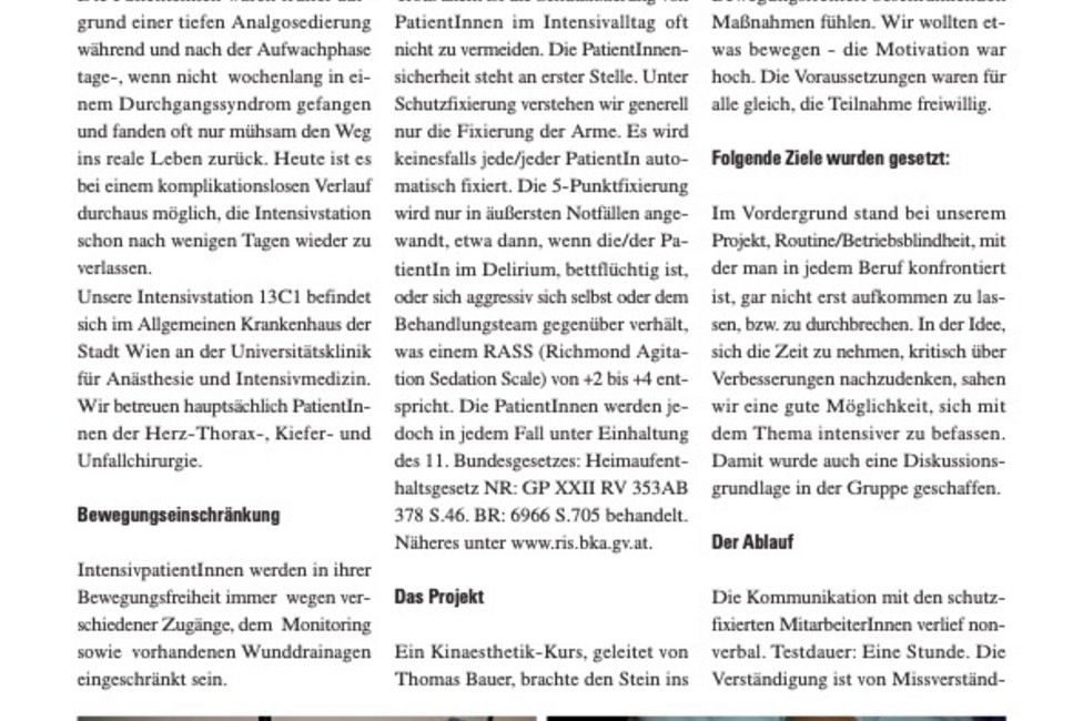 „Menschliche Grauzone Schutzfixierung - Ein Jahr danach – der Nebel lichtet sich!“ verfasst von Irene Lakits und Elisabeth Gogl, erschienen in Intensiv-News, Ausgabe 6, 2013;