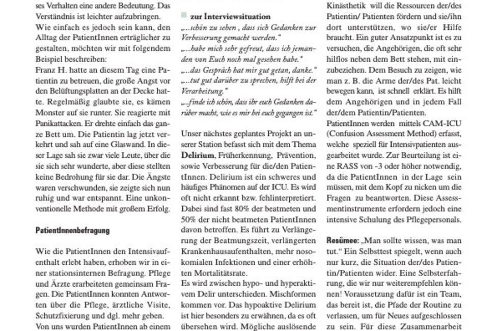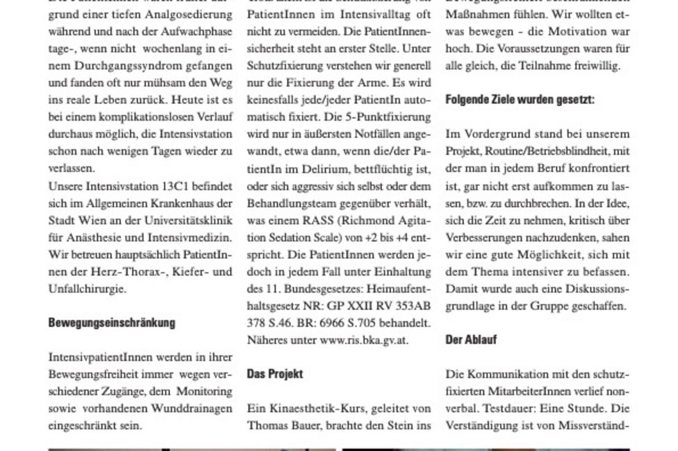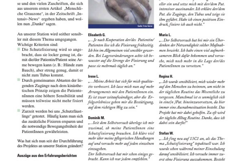 „Menschliche Grauzone: Schutzfixierung im Selbstversuch“ verfasst von Irene Lakits und Elisabeth Gogl, erschienen in Intensiv-News, Ausgabe 6, 2012;