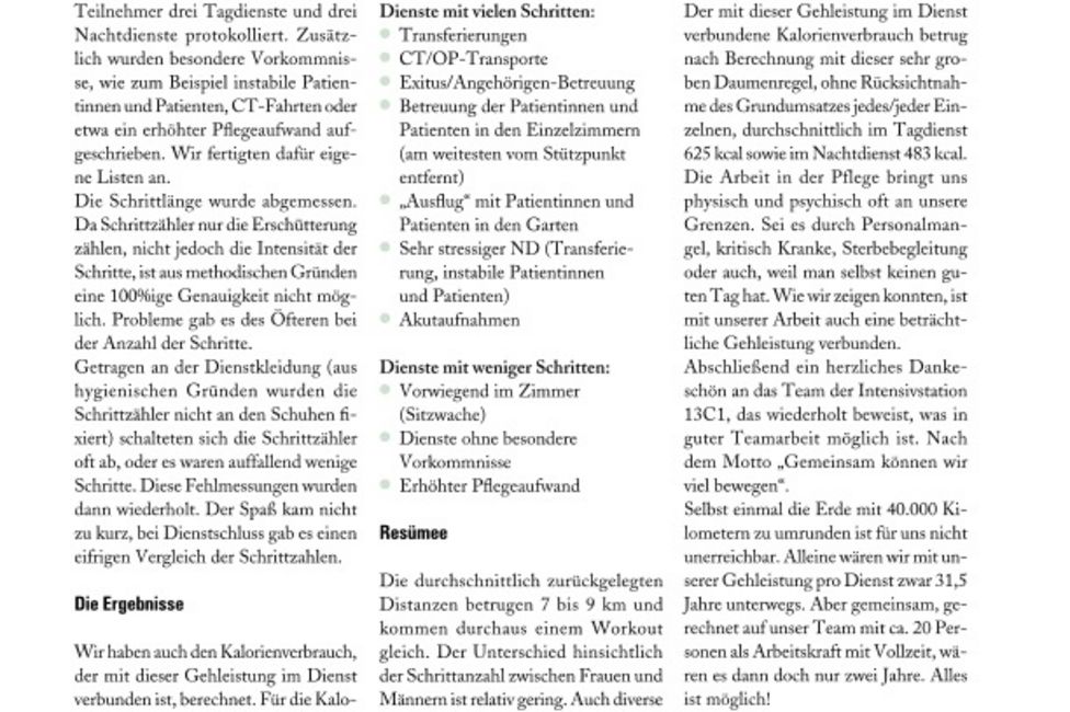 „Gehen ist gesund – Wie viel gehen wir an der Intensivstation im Dienst?“, verfasst von Irene Lakits und Elisabeth Redl, erschienen in Intensiv-News, Ausgabe 2, 2019;