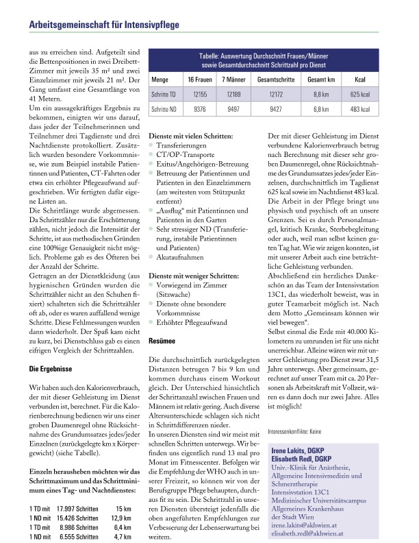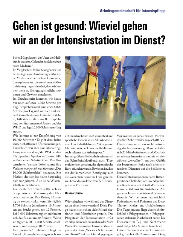„Gehen ist gesund – Wie viel gehen wir an der Intensivstation im Dienst?“, verfasst von Irene Lakits und Elisabeth Redl, erschienen in Intensiv-News, Ausgabe 2, 2019;